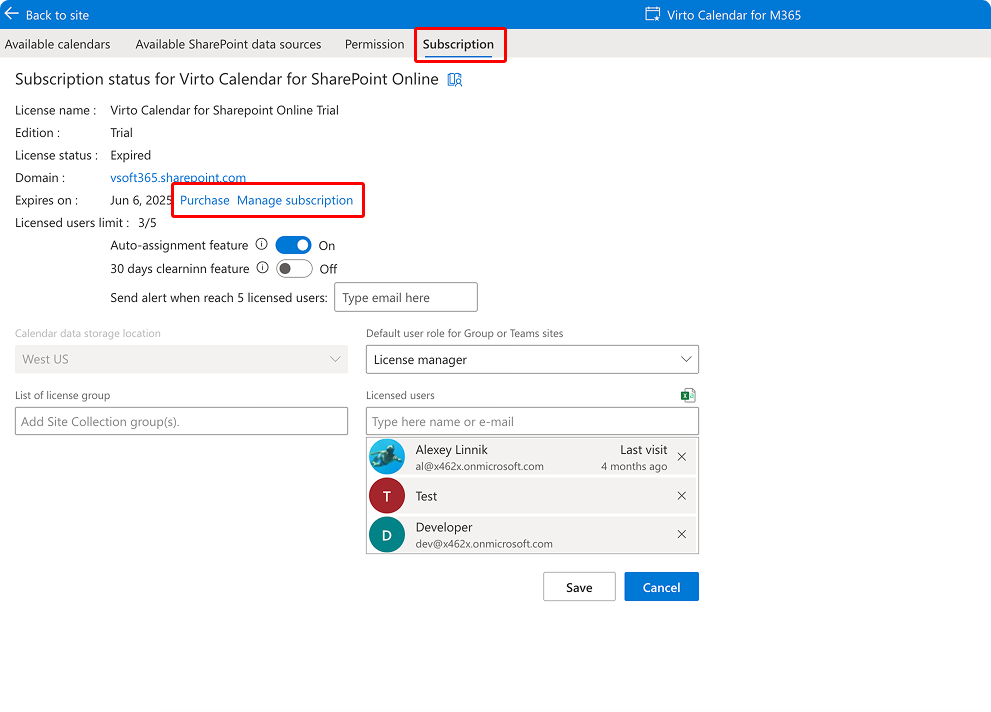 To purchase a license, you have two options: click Purchase to buy directly from VirtoSoftware, or click Manage subscription to buy through Microsoft AppSource as a SaaS subscription. For details on purchasing via AppSource, see Microsoft’s guide: Purchase a software subscription in AppSource.