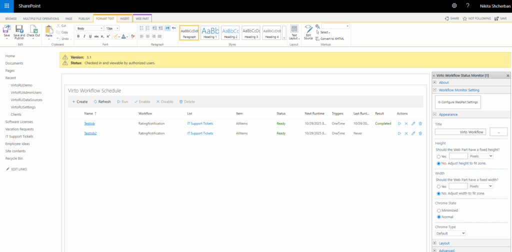 Define the source for the Virto Workflow Status Monitor – listcurrent site or site collection.
