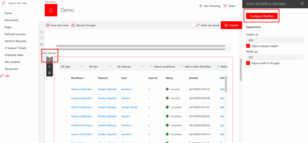 Define the source for the Virto Workflow Status Monitor – list, current site or site collection.