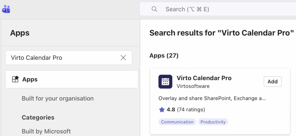 How to find Virto Calendar in Microsoft Teams: type “Virto Calendar Pro”.